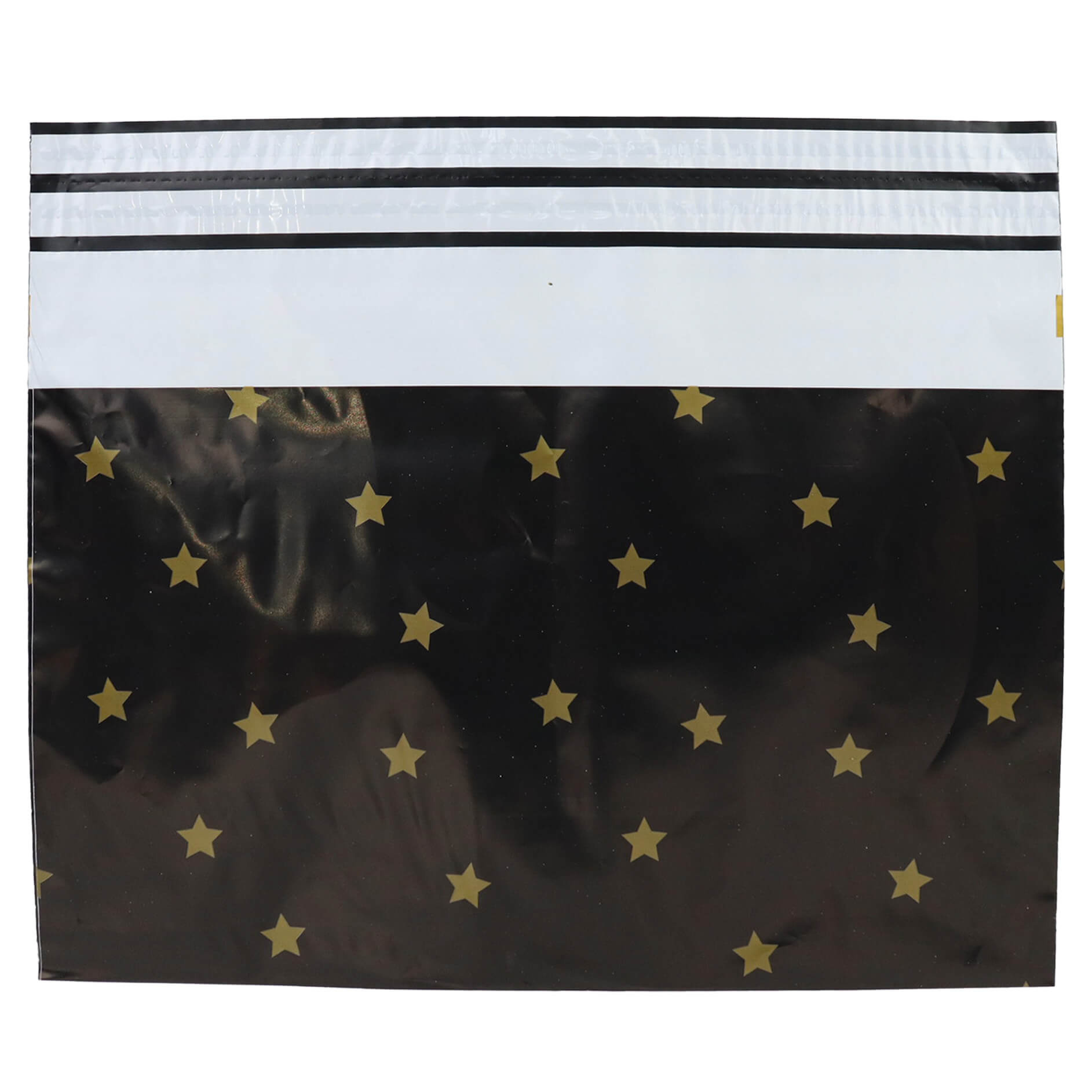 Met de verzendzak Black Gold Stars Large verstuur je grotere bestellingen veilig én stijlvol. De zwarte verzendzak met goudkleurige sterrenprint zorgt voor een luxe en feestelijke uitstraling. Perfect voor het verzenden van kleding, accessoires of meerdere cadeaus. Dankzij de zelfklevende plakstrip verpak je snel en netjes zonder extra tape.