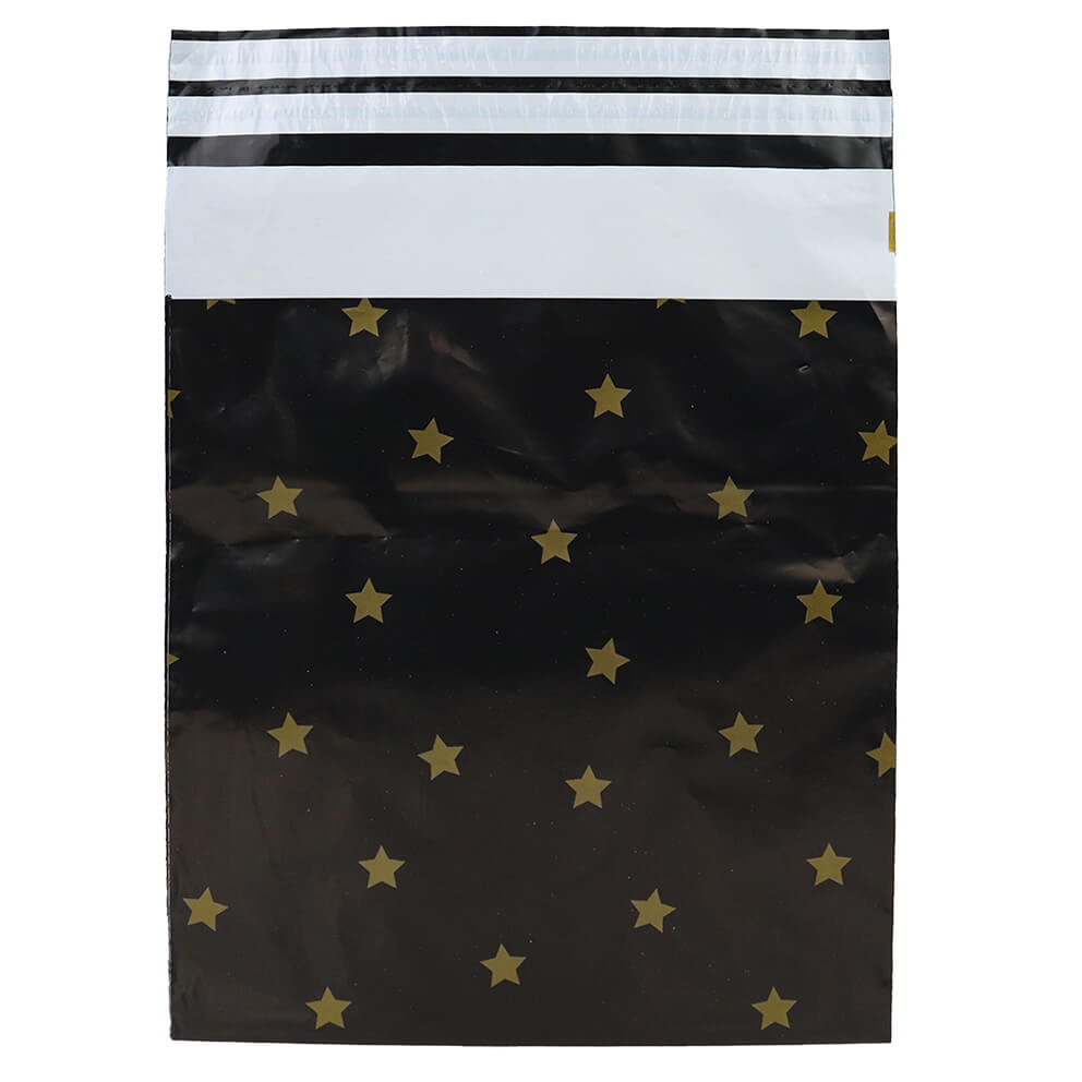 Met de verzendzak Black Stars Medium verstuur je bestellingen veilig en met een luxe uitstraling. De zwarte verzendzak is bedrukt met een goudkleurig sterrenpatroon dat meteen in het oog springt bij de ontvanger. Perfect voor kleding, accessoires of cadeaus die je extra feestelijk wilt verzenden. Dankzij de zelfklevende plakstrip verpak je snel en netjes, zonder extra tape.