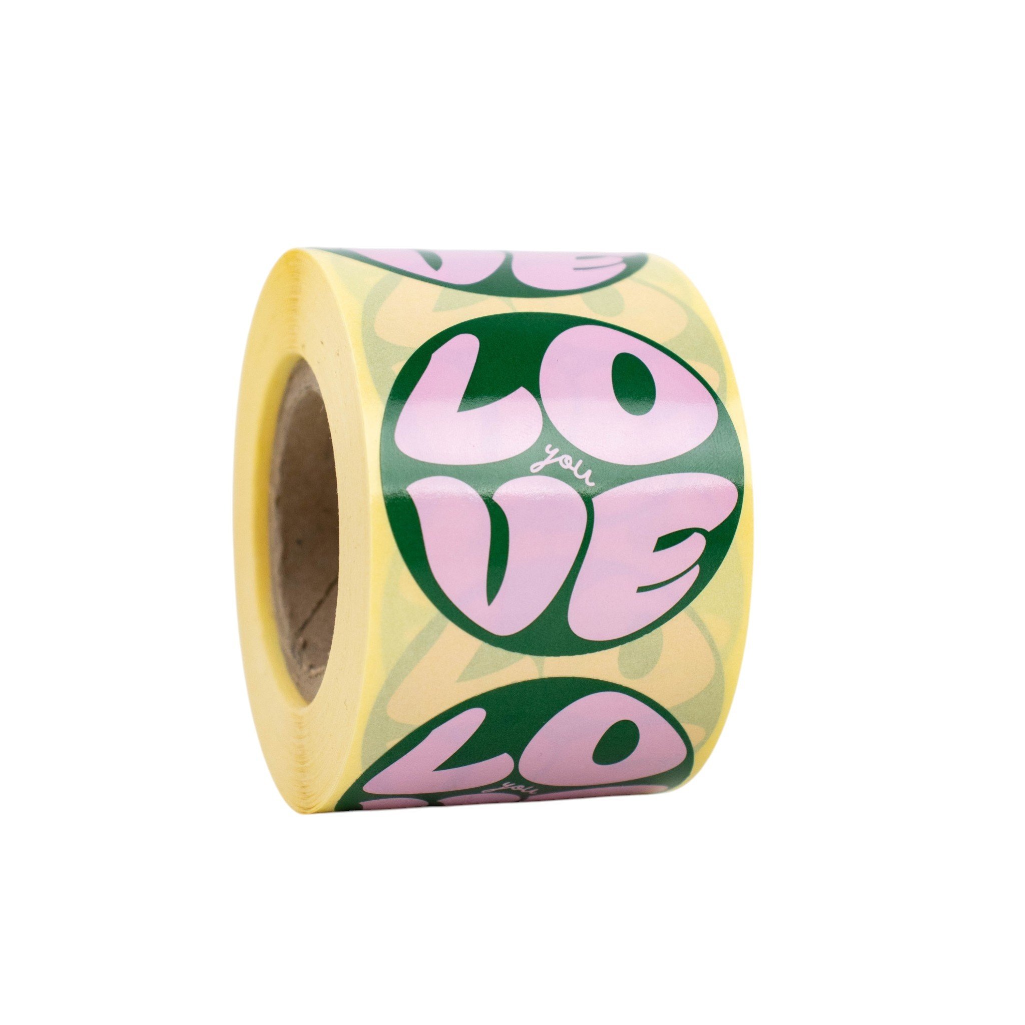 Met deze stickers 'Love you' geef je jouw verpakkingen direct een warme en persoonlijke uitstraling. De combinatie van roze en groen zorgt voor een frisse en vriendelijke look die perfect past bij cadeauverpakkingen en webshops.