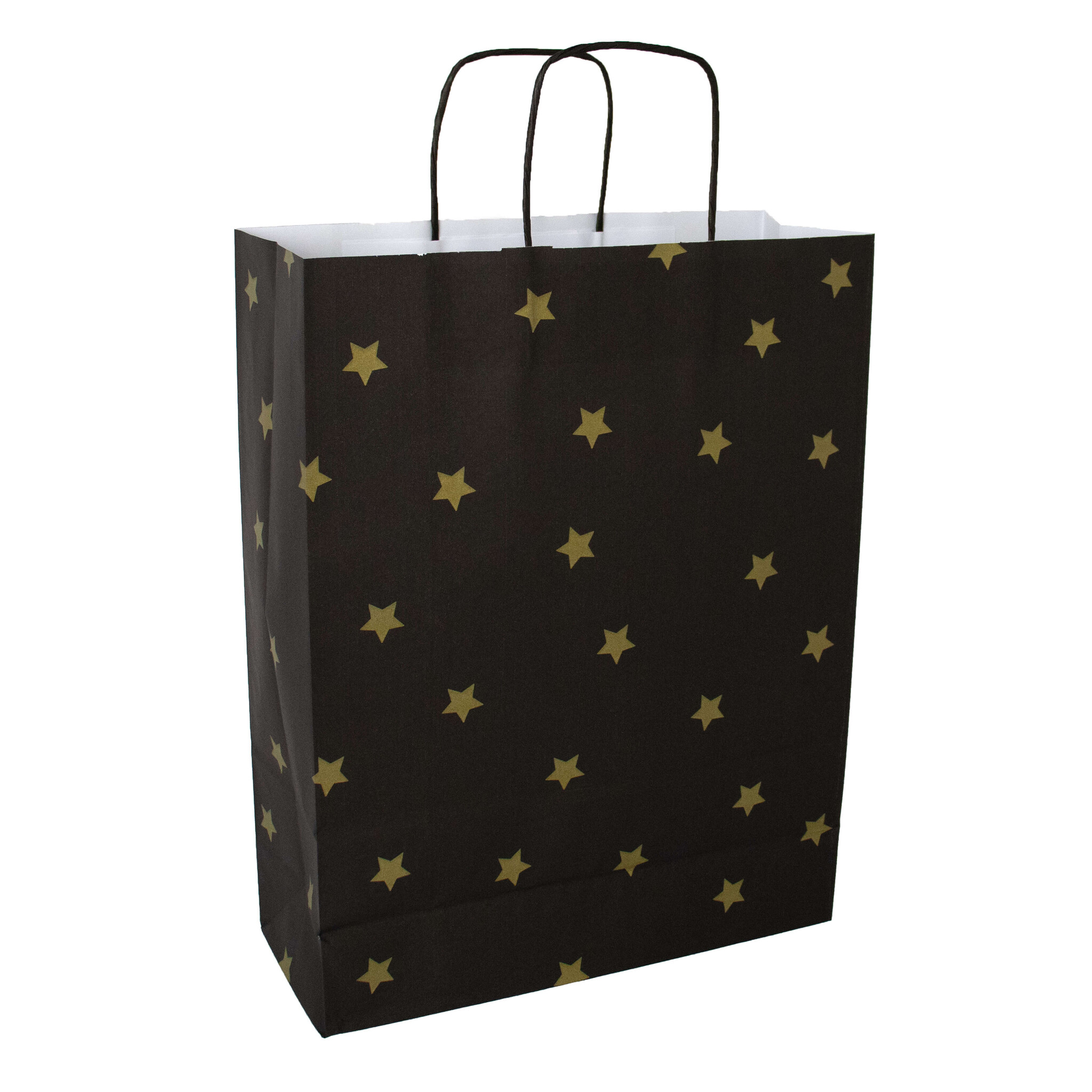De papieren tas Black Stars Gold is perfect voor het stijlvol verpakken van grotere aankopen of cadeaus. De zwarte tas met goudkleurige sterrenprint straalt luxe uit en is voorzien van stevige, gedraaide papieren handvatten voor comfortabel dragen.