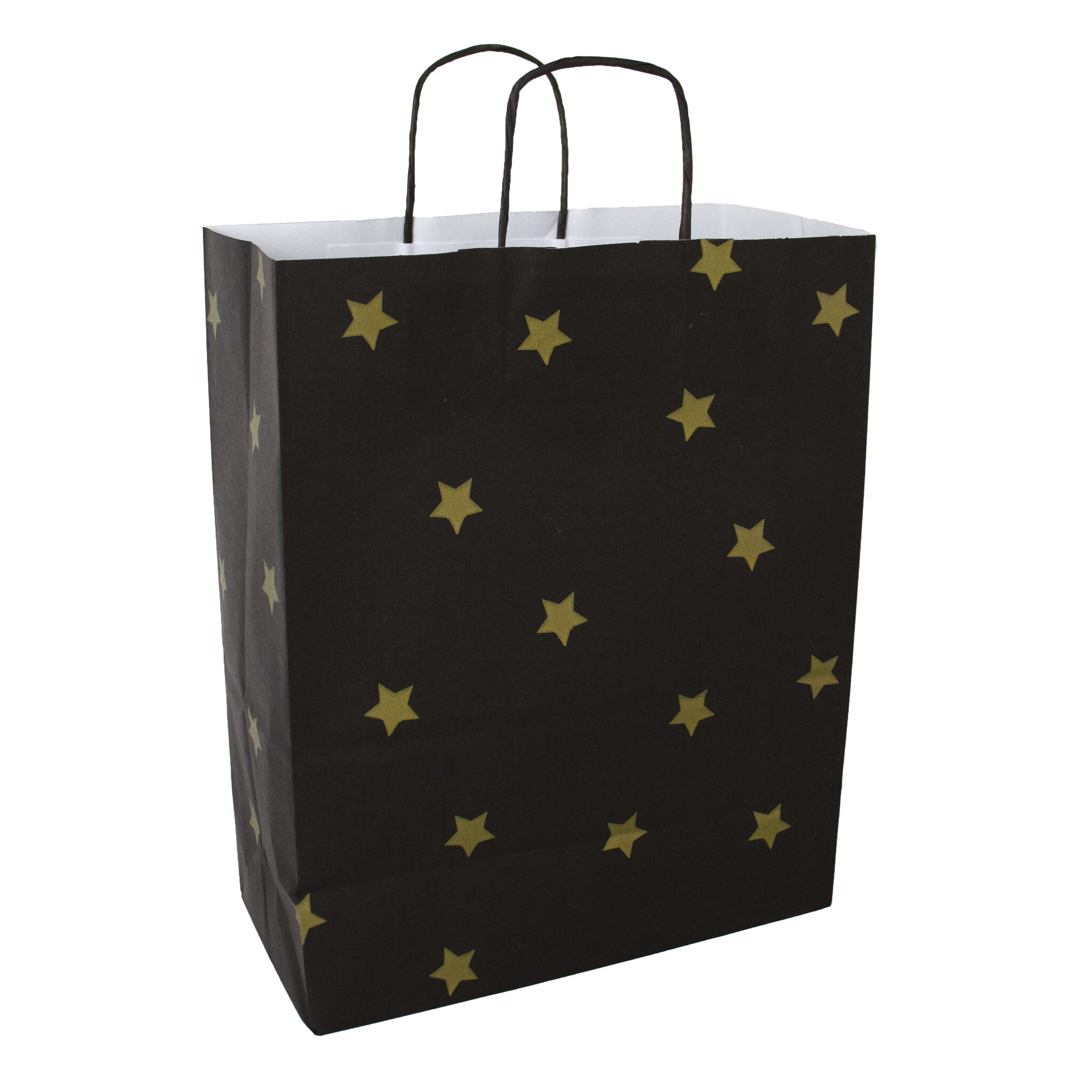 De papieren tas Black Stars Gold combineert een luxe uitstraling met praktisch gebruik. De zwarte tas is bedrukt met een goudkleurig sterrenmotief en voorzien van stevige, gedraaide papieren handvatten. Perfect voor modeartikelen, accessoires of geschenken die je stijlvol wilt presenteren.