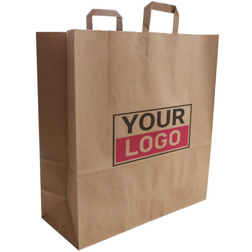Deze budget papieren tas XXL met brede bodem is een praktische en voordelige draagtas voor winkels, horeca en evenementen. De tas is gemaakt van stevig bruin kraftpapier en heeft een ruim formaat van 44 x 16 x 49 cm. Dankzij digitale bedrukking kun je jouw logo of ontwerp eenvoudig laten drukken op de tas.