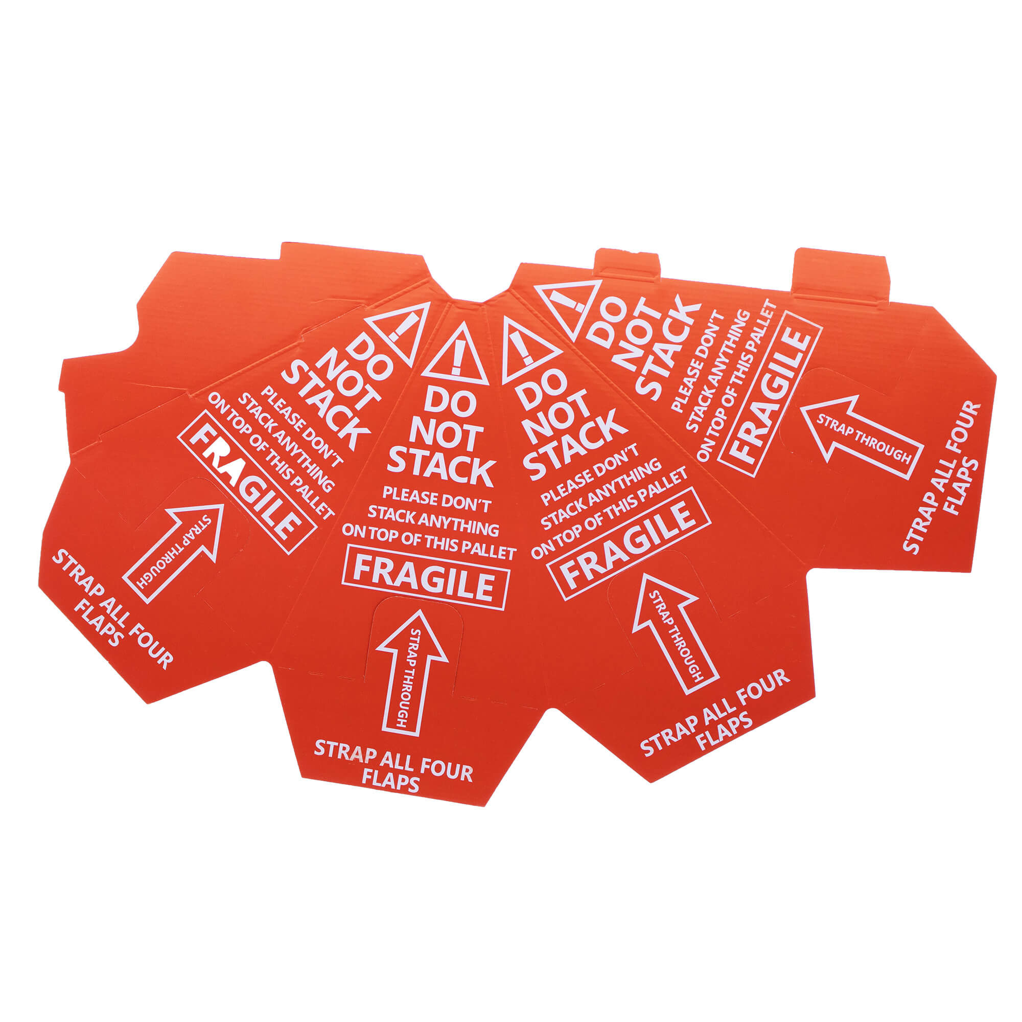 Deze hoedjes zijn geschikt om te plaatsen bovenop pallets of dozen met bijvoorbeeld kwetsbare goederen. Omdat de niet stapelen hoedjes rood zijn, vallen ze op en waarschuwen ze: niet stapelen! De tekst staat geschreven in het Engels zodat de hoedjes ook internationaal te begrijpen zijn. Ze worden plano geleverd, dat wil zeggen dat je ze na ontvangst zelf in elkaar vouwt. De hoedjes zijn gemaakt van stevig karton.
