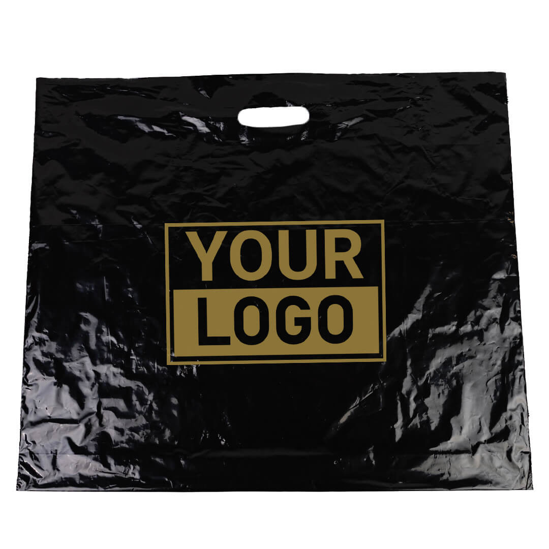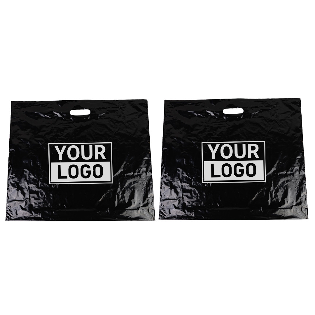 Deze grote zwarte plastic tassen (60x51+2x4cm) zijn ideaal voor het verpakken van kleding, accessoires of grotere aankopen. Laat ze bedrukken met jouw logo of ontwerp en zorg voor een krachtige, professionele uitstraling. Stevig, herbruikbaar en perfect voor winkels, beurzen en evenementen.