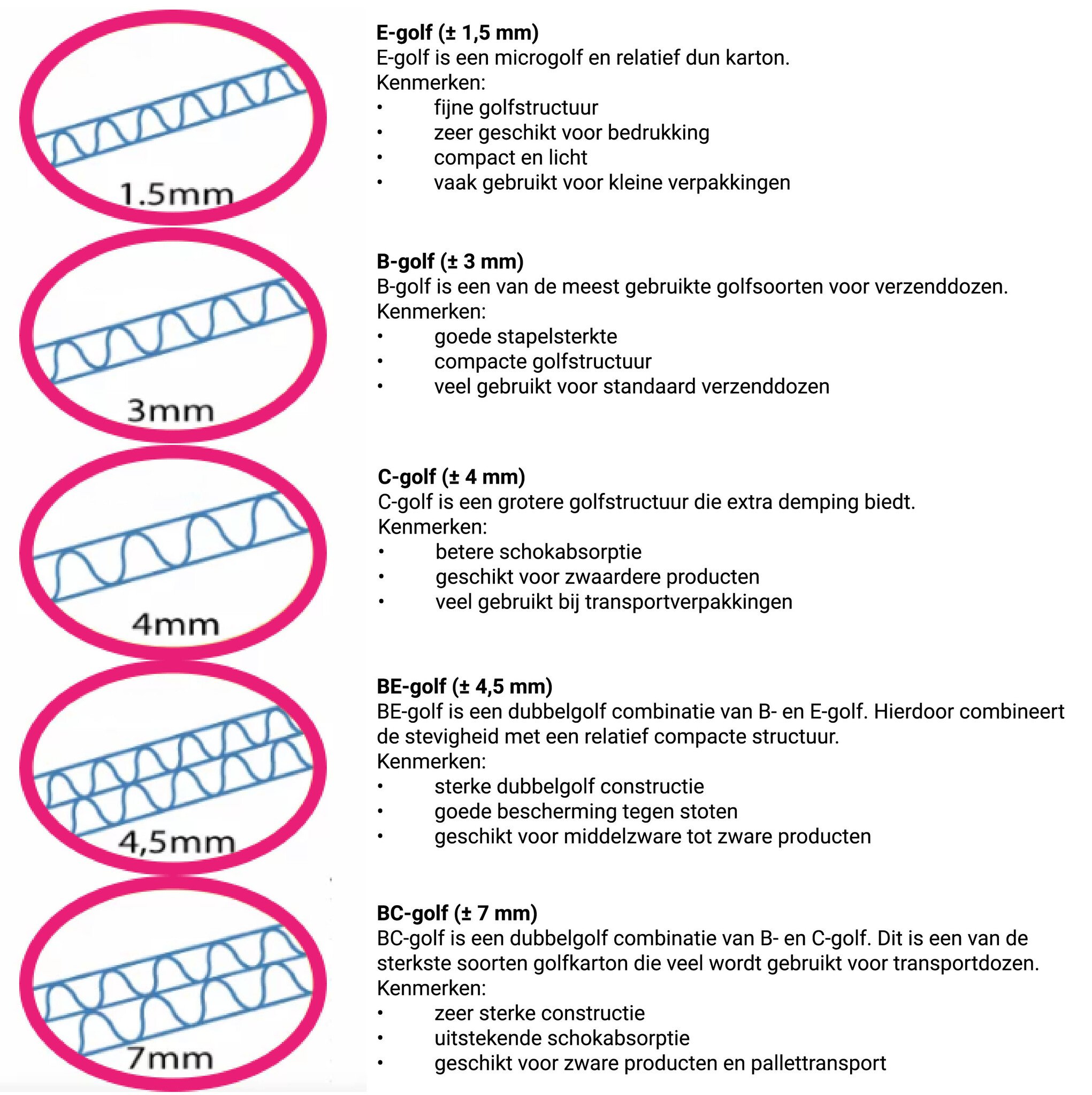 Naast enkelgolf en dubbelgolf speelt ook het type golf een belangrijke rol. Elke golf heeft een andere hoogte en structuur. Dit beïnvloedt de stevigheid, bescherming en bedrukbaarheid van een doos.