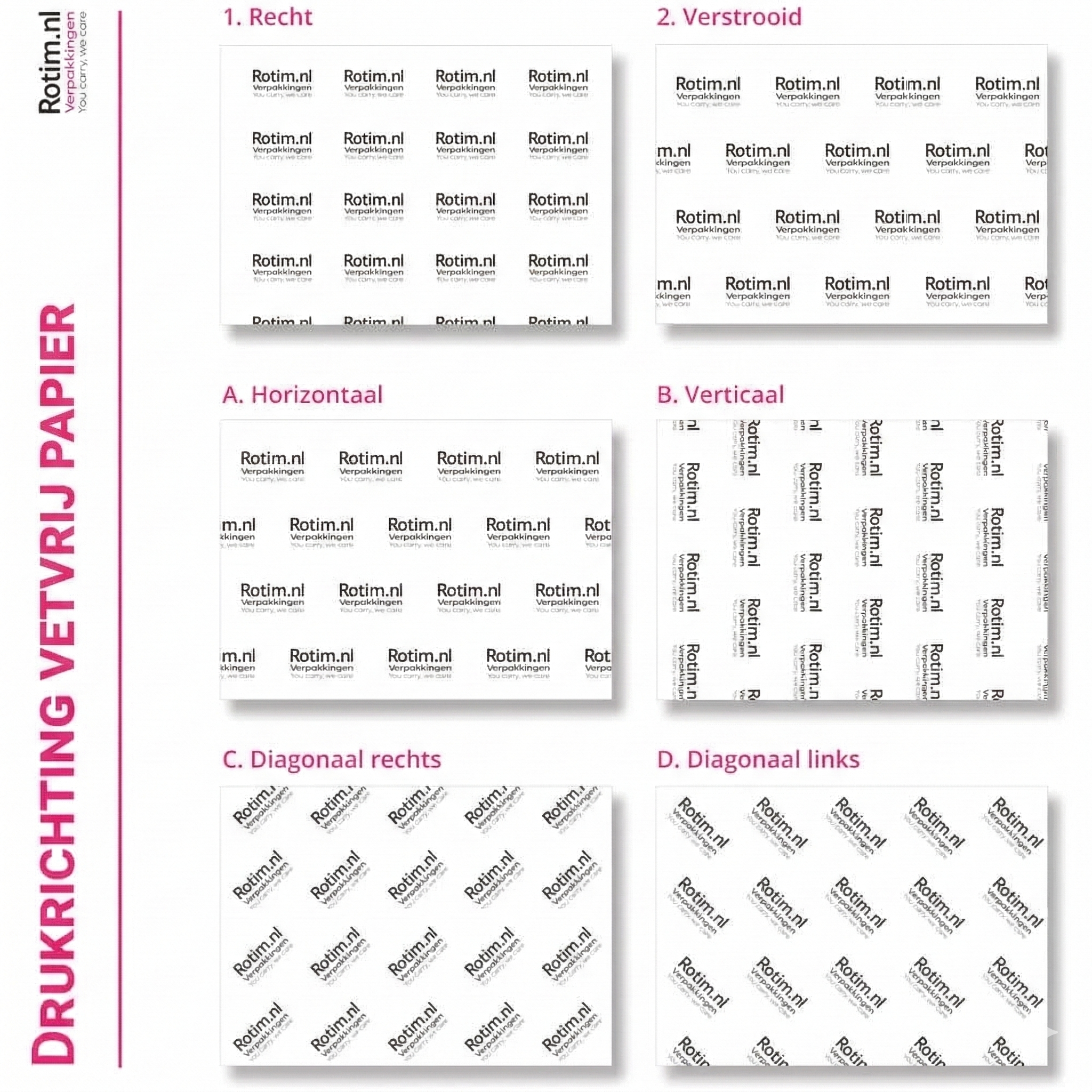 De bedrukking kan horizontaal of diagonaal op het papier worden geplaatst. Hierdoor blijft jouw logo of ontwerp goed zichtbaar, ook bij grotere verpakkingen.