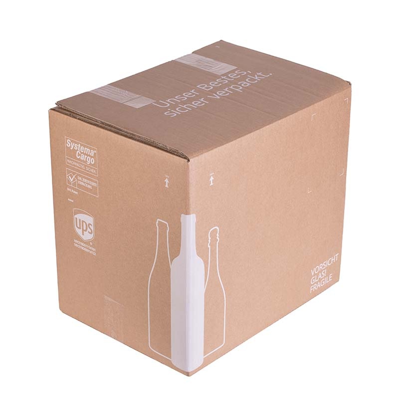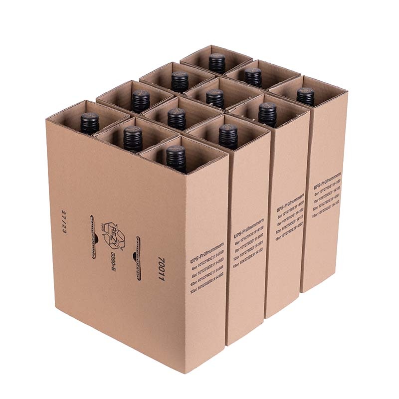 De omdoos en de inlays zijn gemaakt van dubbel golfkarton met een BC golfhoogte van ca 7 mm. Door de manier waarop de inlays in elkaar gevouwen moeten worden, zijn de flessen allemaal rondom beschermd door 2 lagen karton. Dit betekent dus een beschemende laag van 1,4cm karton om elk van de flessen.