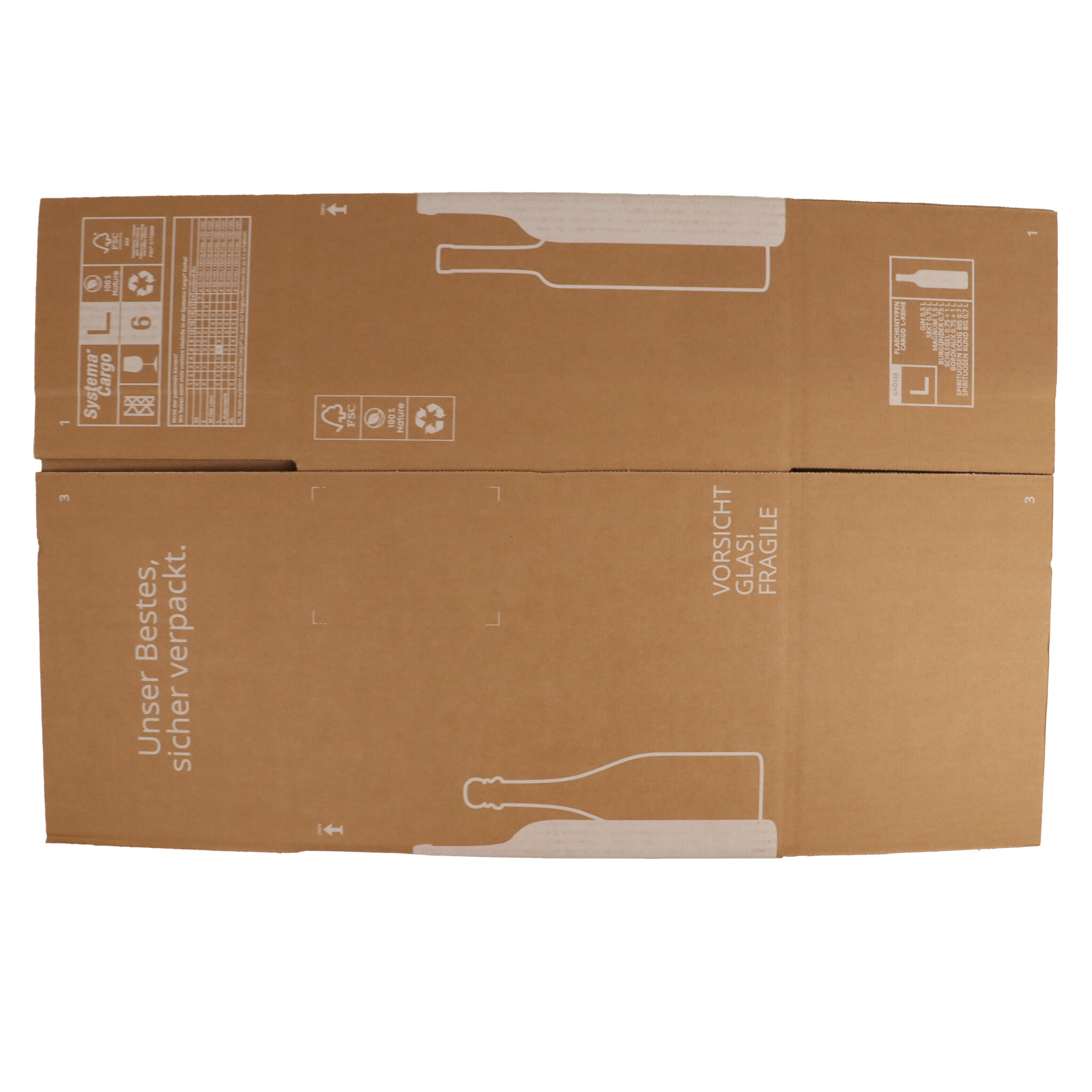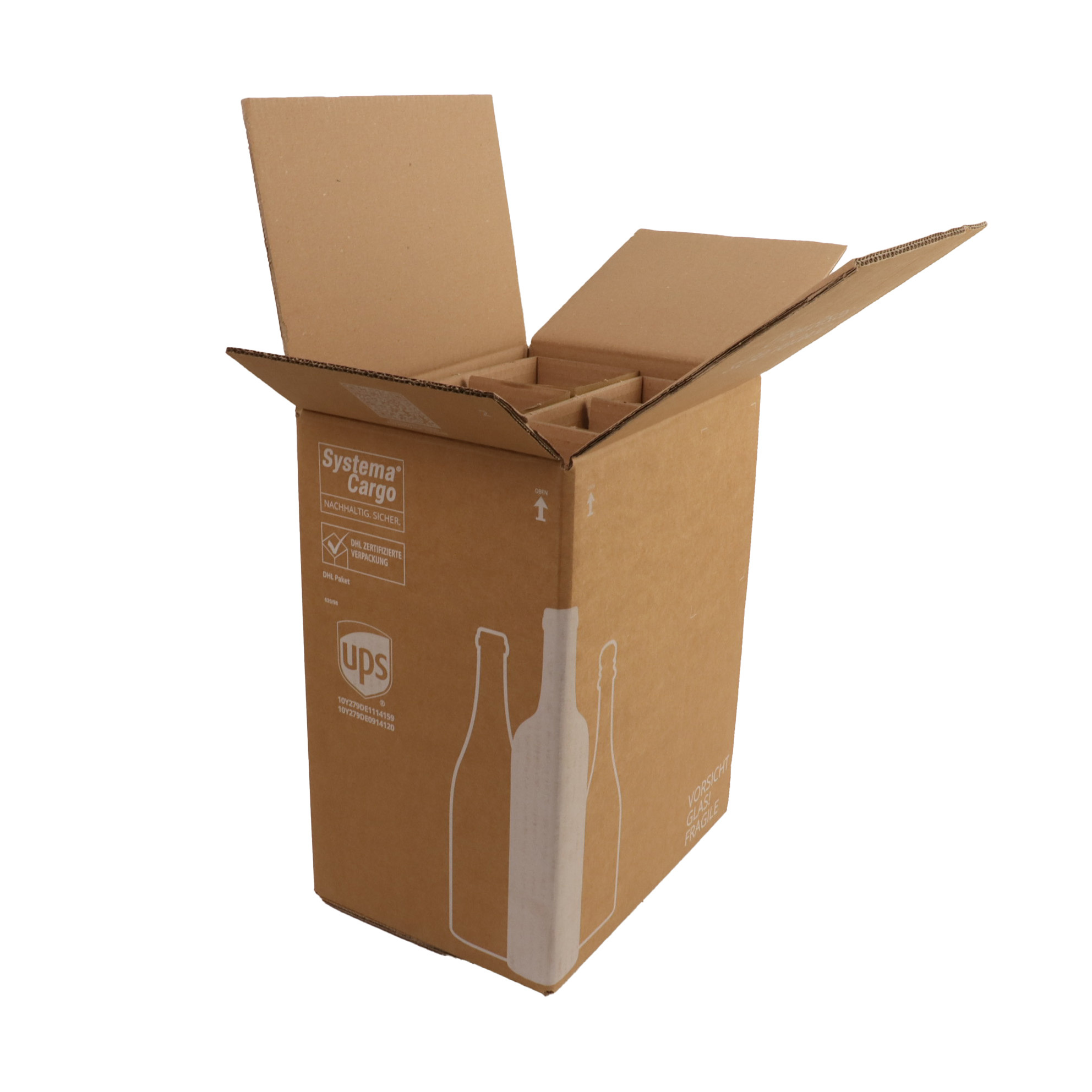De verzenddozen zijn aan de onder- en bovenkant voorzien van sluitkleppen die de gehele vulopening beslaan. De sluitkleppen overlappen elkaar, dus ook hier een dubbele laag karton zodat de flessen veilig verstuurd kunnen worden. De verzenddozen zijn niet voorzien van plakstrips en moeten dus nog dichtgeplakt worden met tape. Houdt er wel rekening mee dat dubbel golfkarton minder makkelijk buigt en er een spanning staat op het buigpunt van de sluitkleppen. Gebruik dus tape met een goede hechtkracht voor het dichtplakken van de verzenddozen.